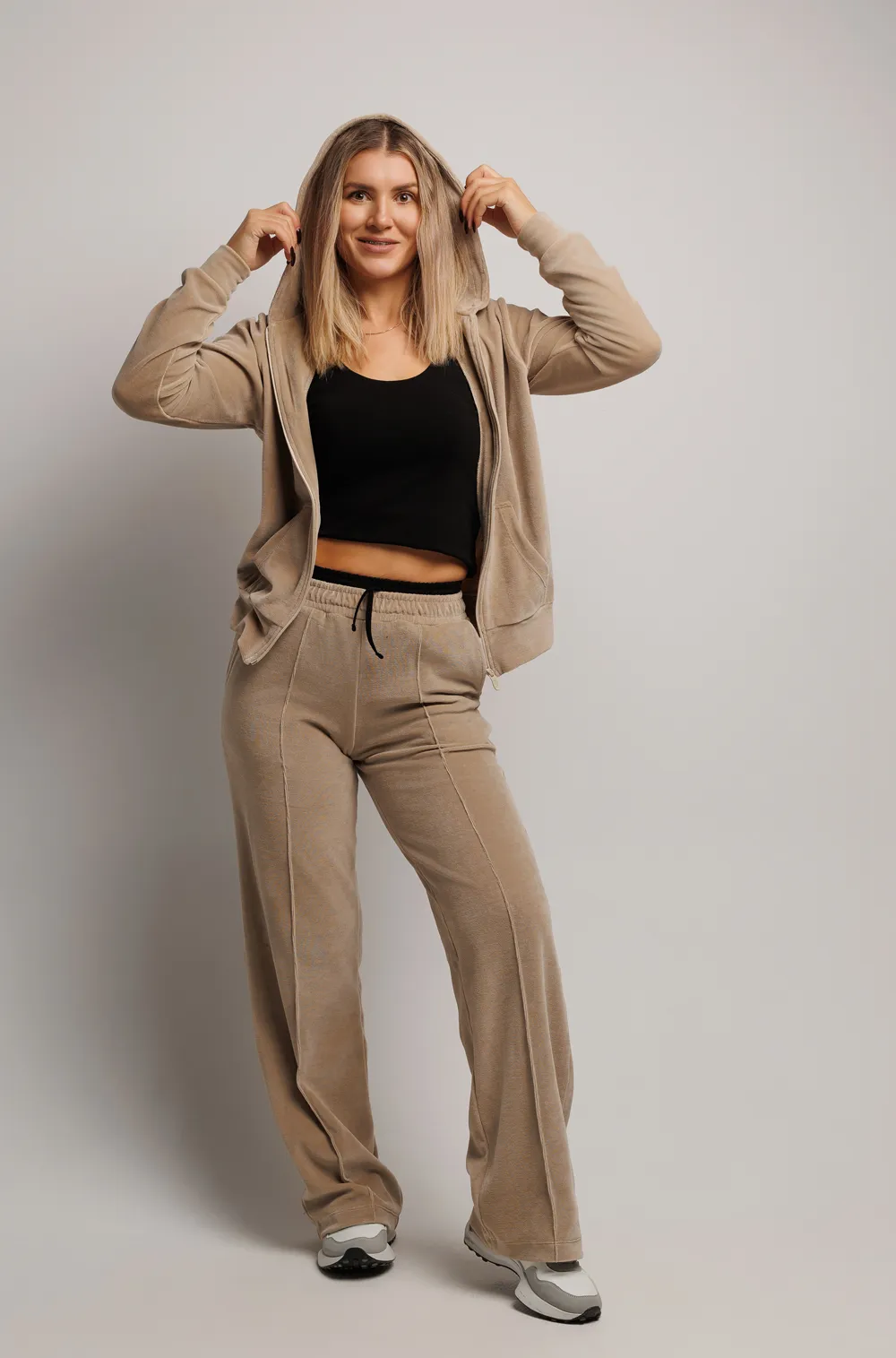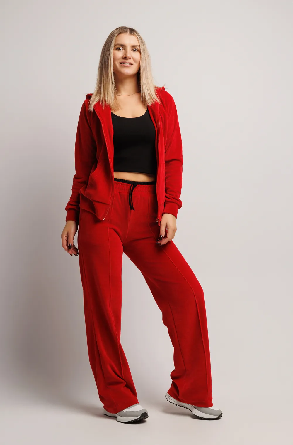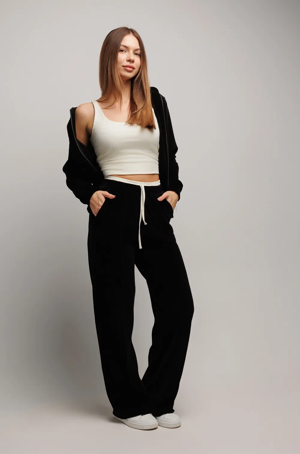 В комплект входят: брюки, толстовка на молнии и топ.
